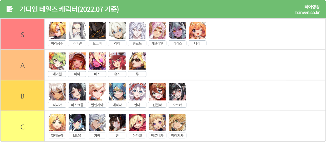 S등급에 추가적으로 1군단장, 안드라스, 은하 추가 입니다. 티어표 같은 경우는 참고용이지 100%를 생각하시면 안되구요 각 컨텐츠마다 쓰이는게 캐릭터가 많기 때문에 참고용으로 보시면 좋을것 같습니다.