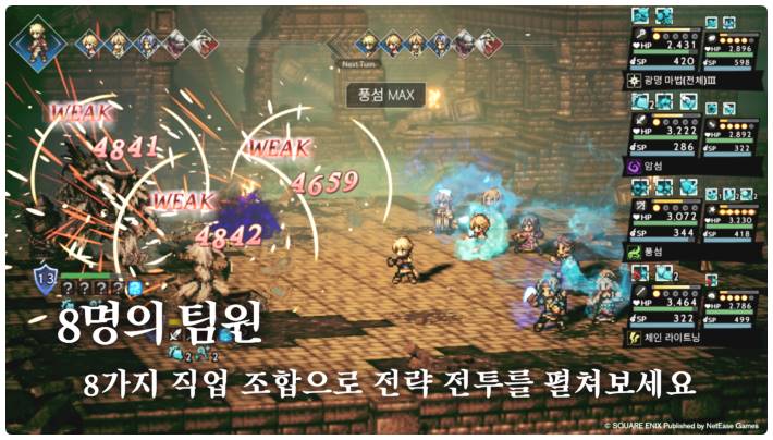 8명의 팀원 8가지 조합으로 전략적인 전투를 벌일 수가 있습니다. 턴제 게임의 호불호만 없다면 더욱 전략성으로 플레이를 할 수가 있습니다.
