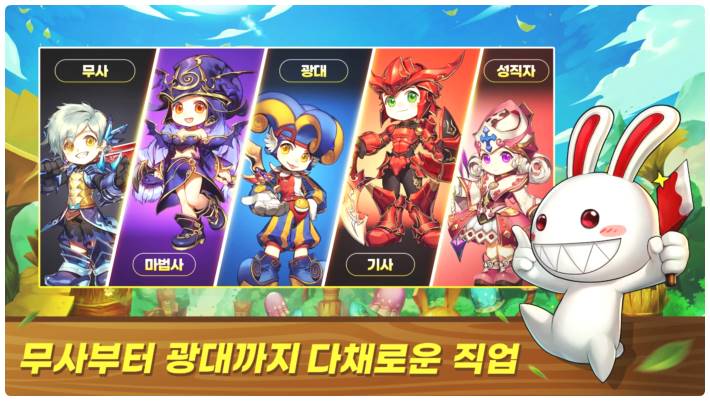 기사, 무사, 마법사, 광대, 성직자 5가지 캐릭터로 선택이 가능합니다. 역시나 원거리 딜이 가능한 마법사, 성직자가 가장 유리하지 않을까 생각이 드네요 이후로 2가지 캐릭터가 추가로 출시를 한다고 하네요