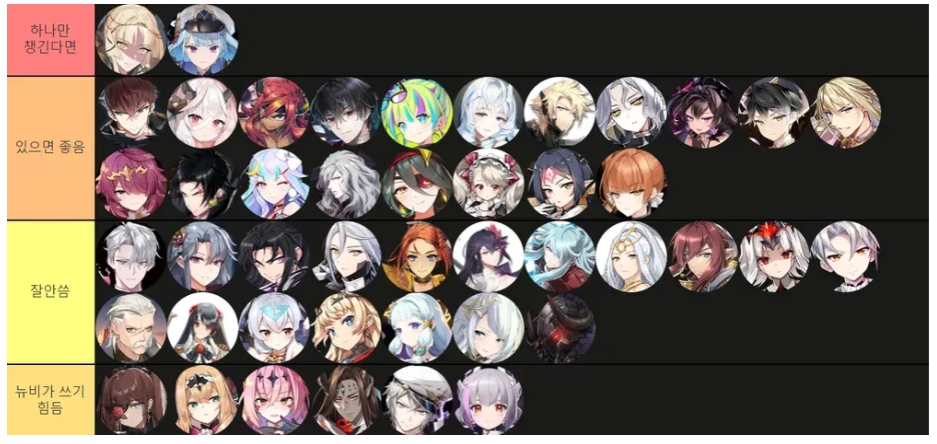 현재 최신 등급표 인데요 컨텐츠에 따라서 약간 변경이 되긴 하겠지만 현재 월광 캐릭터 중 가장 좋다고 평가를 받는게 2개의 캐릭터가 있습니다. 해군대령 랑디, 심연의 유피네 2가지 인데요 사실 2가지가 있는 캐릭터가 흔하지 않기 때문에 둘중에 1개와 다른 월광을 선택하셔서 가시는게 좋습니다.