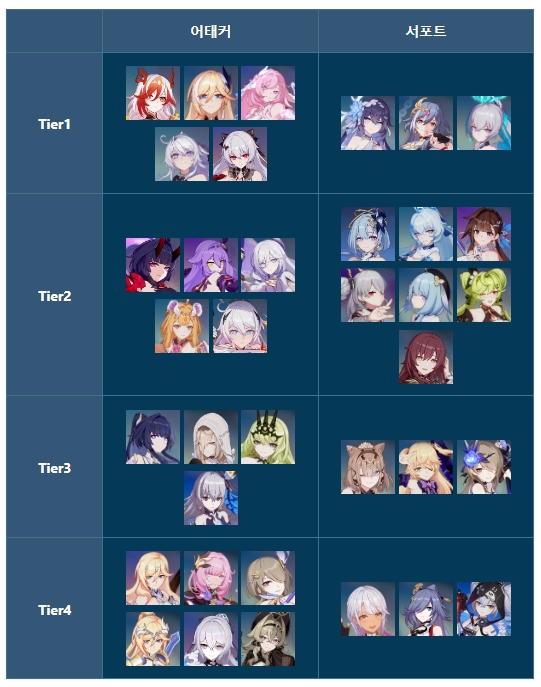게임 출시가 된후에 꾸준하게 새 캐릭터가 출시가 되어서 그런지 캐릭터가 상당히 많습니다. 티어표는 참고정도만 하시면 좋을것 같네요 또한 초보자와 복귀유저에게 지속적으로 혜택을 제공하고 있기 때문에 언제든지 플레이를 하셔도 문제가 없습니다.