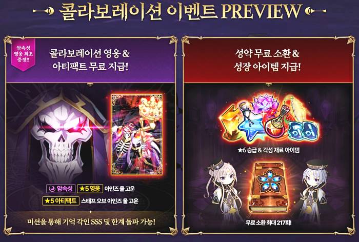 역시나 이번에도 에픽세븐은 콜라보를 제대로 하네요 다른 게임처럼 약간 애매하게 하는게 아니라 확실하게 하는데요 많은분들이 보셨을만한 애니메이션 오버로드와 콜라보레이션을 합니다. 이소식도 좋지만 역시나 가장 중요한게 오버로드 주인공 캐릭터 5성 아인즈 울 고운 월광 5성 캐릭터를 무료로 배포를 한다고 하네요
