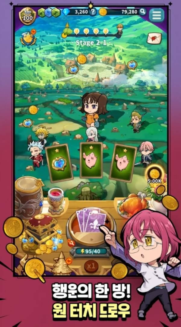 세로화면의 원터치 드로우로 전략적인 전투를 하고 애니메이션 스토리를 그대로 즐길 수가 있습니다. 원터치 드로우 방식은 행운이 필요한 방식으로 한방의 쾌감을 느낄 수가 있다고 합니다. 캐릭터 모델링은 특징을 잘 살렸으며 SD캐릭터의 귀여움으로 잘 모델링 된 것 같네요