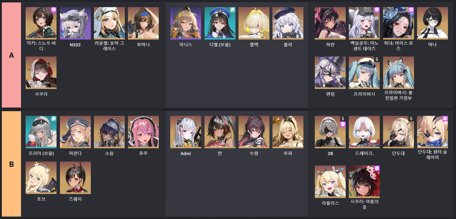 니케는 3개의 포지션으로 버스트1~ 버스트3까지 존재합니다. 역할별로 총 5명의 캐릭터를 조합해서 전투를 할 수가 있습니다. 역시나 오픈초기부터 지금까지 계속 상위 티어를 차지 하고 있는 리타가 여전히 최상위 티어를 차지하고 있네요