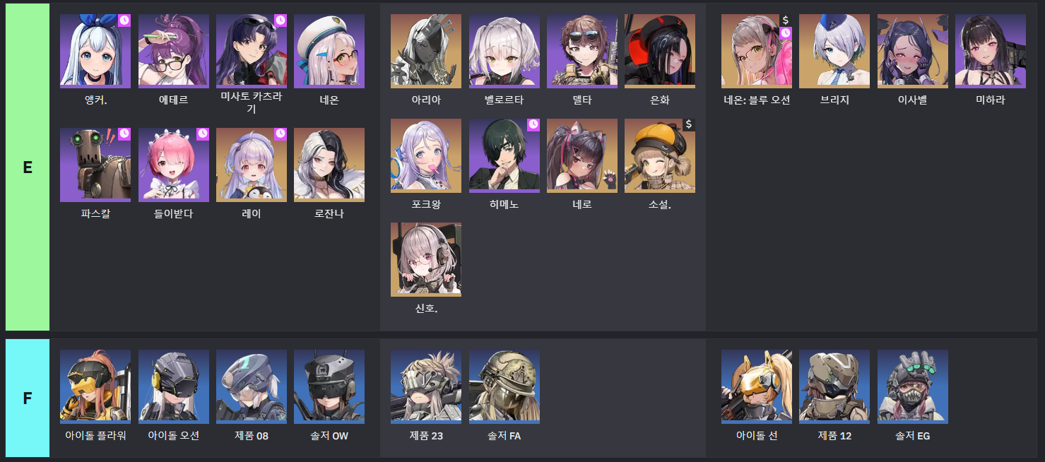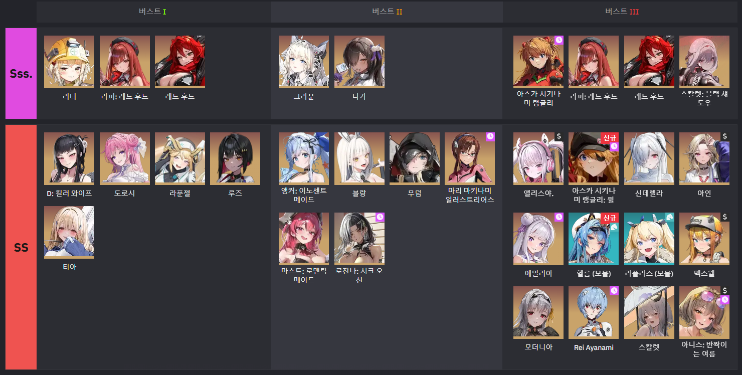 니케는 3개의 포지션으로 버스트1~ 버스트3까지 존재합니다. 역할별로 총 5명의 캐릭터를 조합해서 전투를 할 수가 있습니다. 역시나 오픈초기부터 지금까지 계속 상위 티어를 차지 하고 있는 리타가 여전히 최상위 티어를 차지하고 있네요