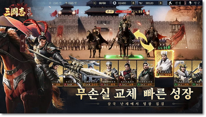 마을을 건설하고 경영하면서 자원은 자동으로 생상이 가능하며 삼국지의 유명 장수들을 육성하면서 SLG 자원과 경제를 관리해 병력 운영이나 전투계획 등 전략적인 플레이를 할 수 있습니다.