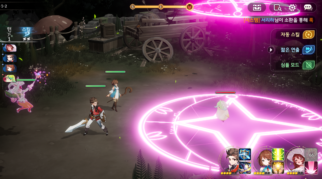 턴제 전투는 직관적이며, 스킬 예약(최대 3개)과 방어덱 개념을 추가해 전략성을 강화했습니다.