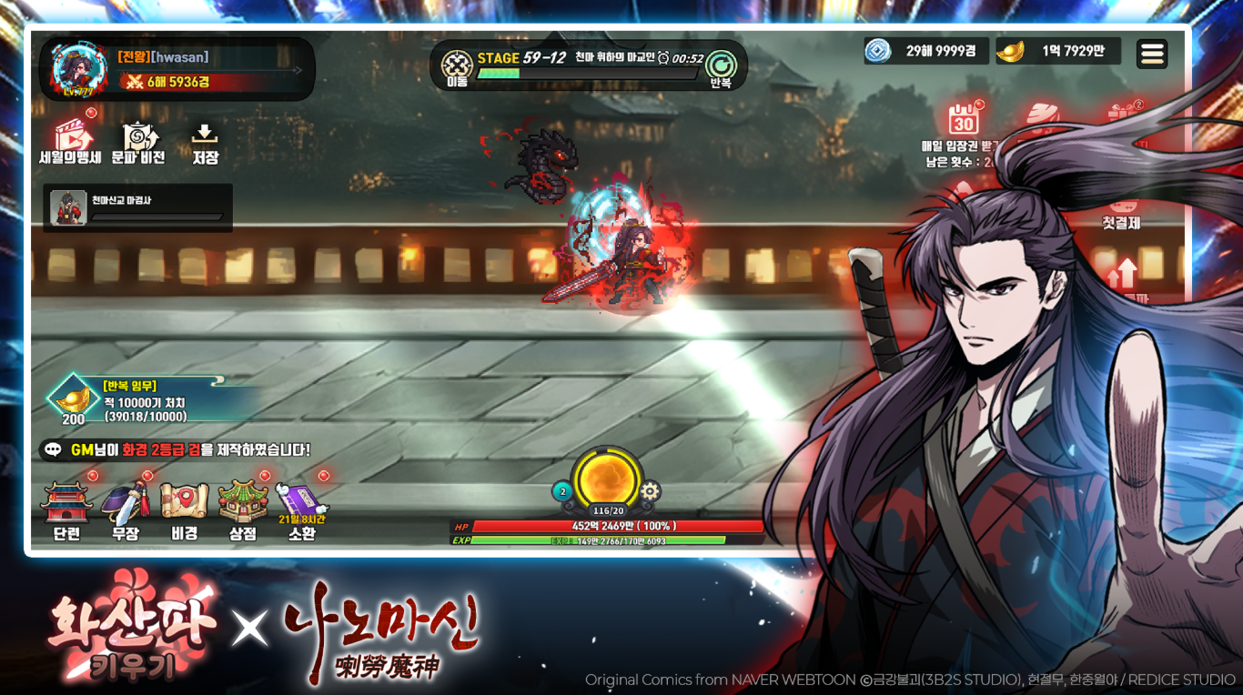 유명 웹툰 나노마신과 역대급 콜라보레이션으로 나노마신을 화산파 키우기에서 즐길 수가 있습니다. 천여운, 왕여군, 문규, 문란영이 등장 합니다.