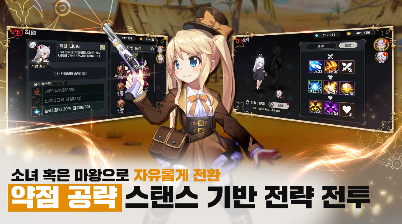 전략적 전투와 자유로운 성장 시스템 소녀(마법사)와 마신(전사)을 상황에 따라 전환하며 전투를 진행할 수 있어 전략적 재미가 돋보이며 23종의 직업군, 32종의 동료, 234종의 몬스터, 70종 이상의 맵, 96종의 장비 등 방대한 콘텐츠로 수집과 성장의 재미를 제공합니다.