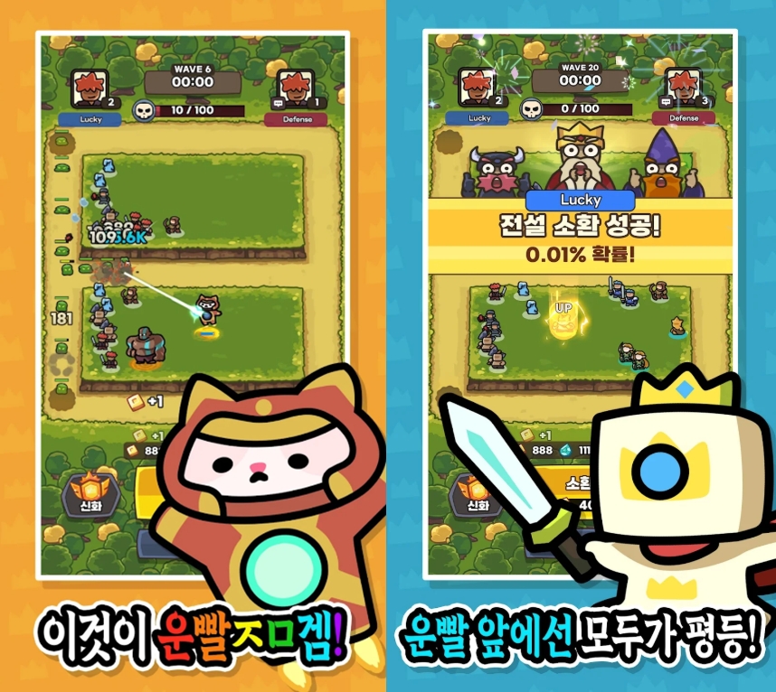 운빨존많겜은 2인 협동 플레이를 기반으로, 몬스터 웨이브를 막기 위해 랜덤으로 소환된 유닛을 배치하고 강화하며 전략적으로 방어하는 게임입니다.