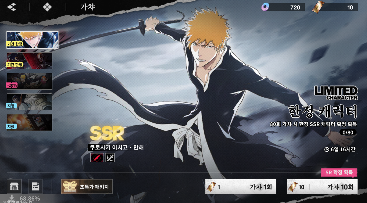 뽑기가 꽤나 맵습니다. 단 80회 뽑기시 천장으로 한정 SSR 캐릭터를 얻을 수가 있습니다.