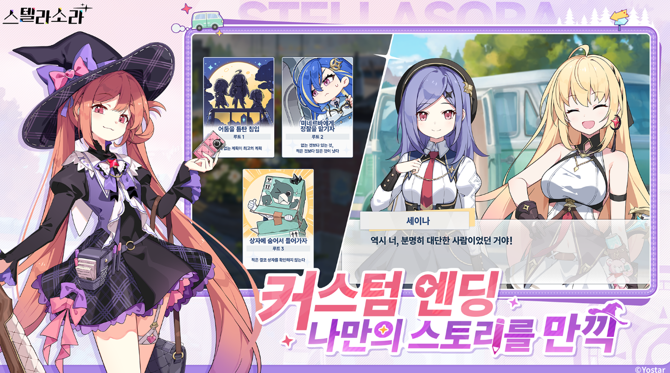 스텔라 소라는 요스타에서 자체 개발·서비스하는 애니메이션풍 판타지 액션 어드벤처 RPG로, 2025년 10월 20일 정식 출시됐습니다. 마왕이 된 플레이어가 귀여운 소녀 여행가들과 함께 별의 탑을 오르며 모험하는 이야기예요. 뱀서류 스타일의 로그라이크 액션 + 덱빌딩 요소가 핵심으로, 자동 전투에 스킬·회피를 더한 가벼운 플레이가 특징입니다