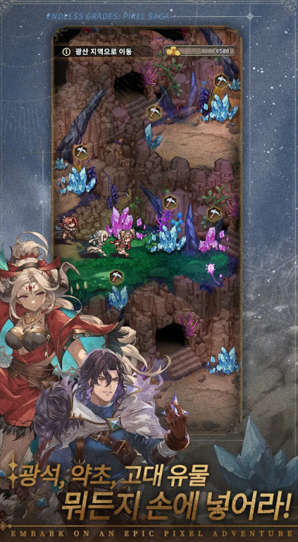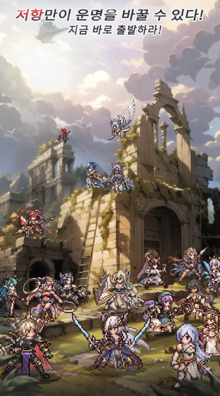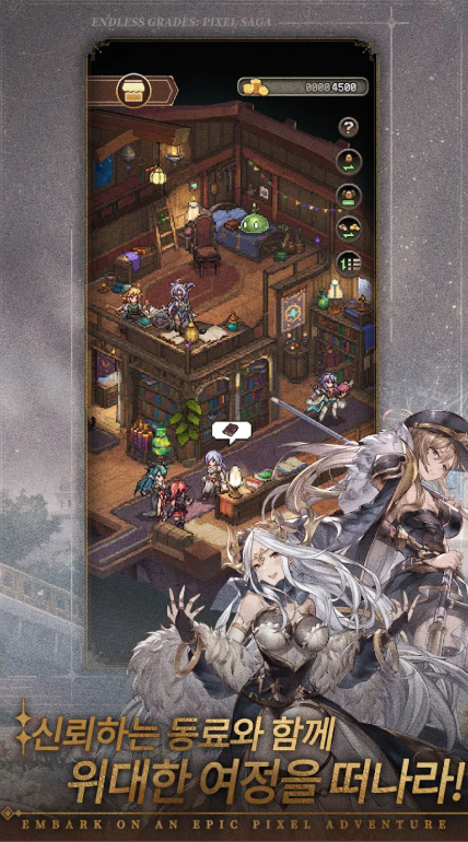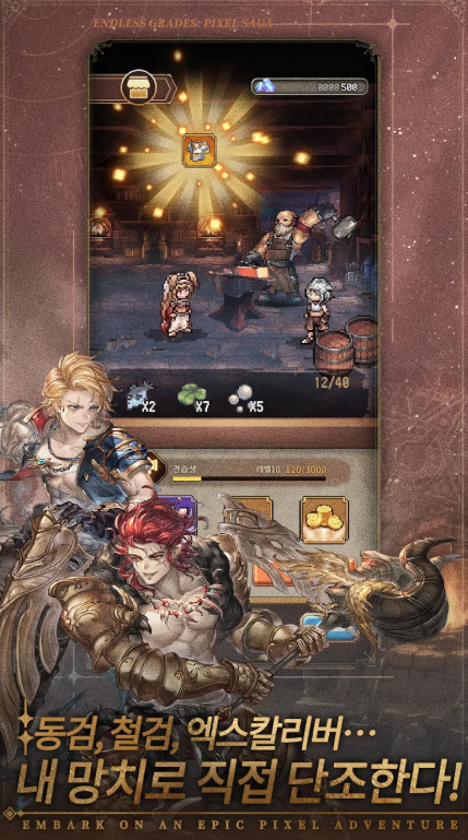 고퀄 도트 그래픽으로 과거 JRPG 향수를 불러일으키면서도 폭풍 성장 시스템 빠른 전투력 상승, 영웅 간 레벨/장비 공유 (교체 시 손실 없음) 전략적 전투 속성/직업/진영 상성, 전열·후열 배치, 스킬 연계 풍부한 콘텐츠 던전 탐험, 보스전, 유물 수집, 슬라임/소환수 육성, 아레나 PVP, 길드 시스템 등의 다양한 컨텐츠가 있습니다.