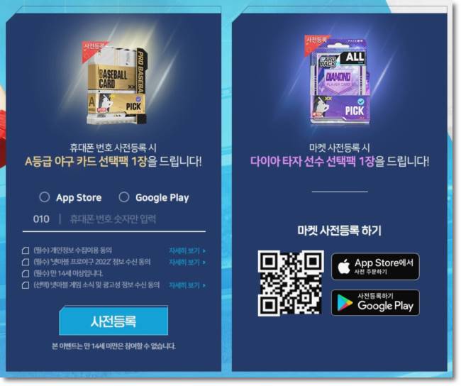 넷마블 프로야구 2022 사전예약은 사전다운로드시작전까지 가능하고 사전예약 보상으로는 A등급 야구카드 선택팩 1장, 다이아 타자선수 선택팩 1장을 받을 수가 있으니 마켓 사전등록까지 해주는게 인지상정이죠
